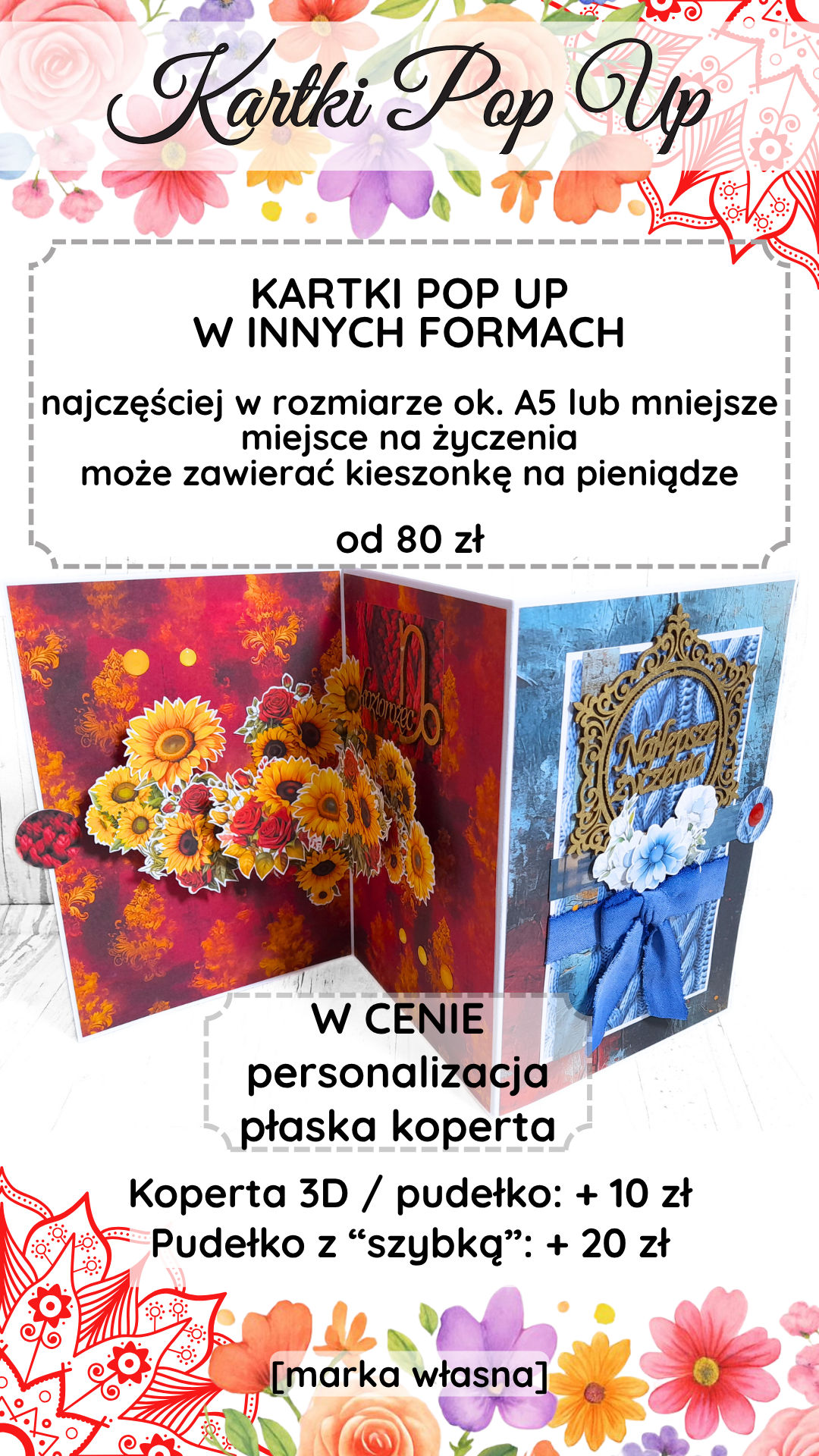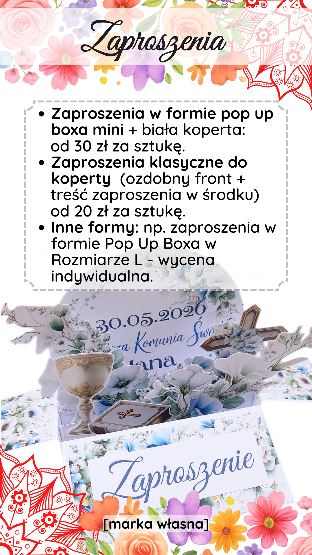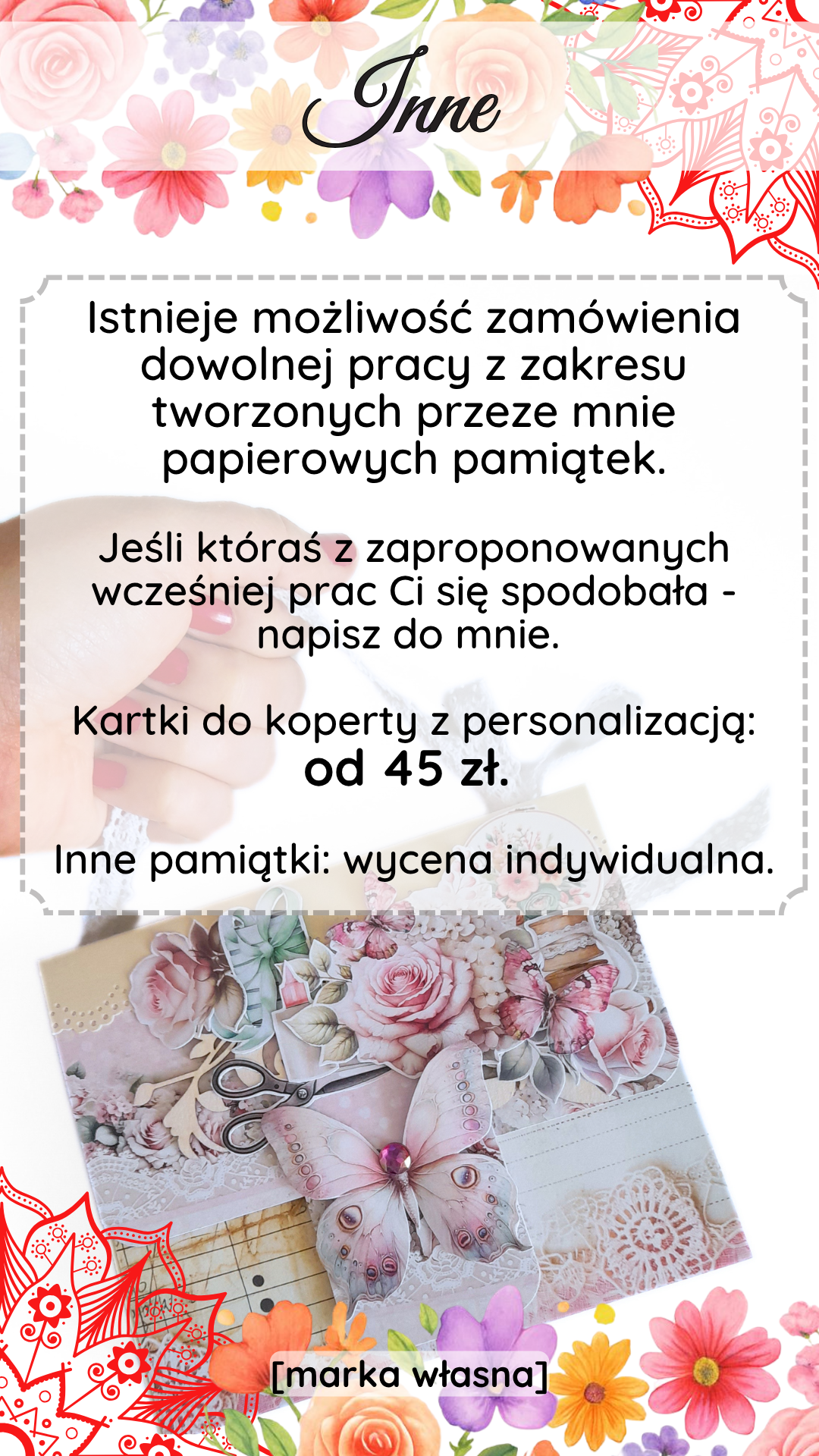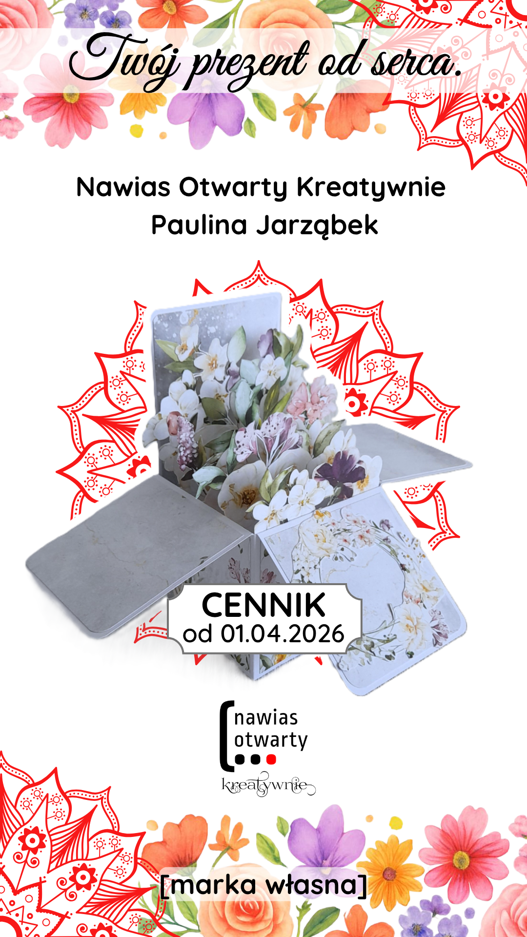 na Instagramie (nawias.otwarty.kreatywnie), Facebooku (Nawias Otwarty Kreatywnie) albo wyślij mi e-mail na adres paulina@nawiasotwarty.pl – ustalimy szczegóły. Możesz wybrać formę z Cennika albo poprosić mnie o polecenie czegoś na konkretną okazję. - Podaj szczegóły: