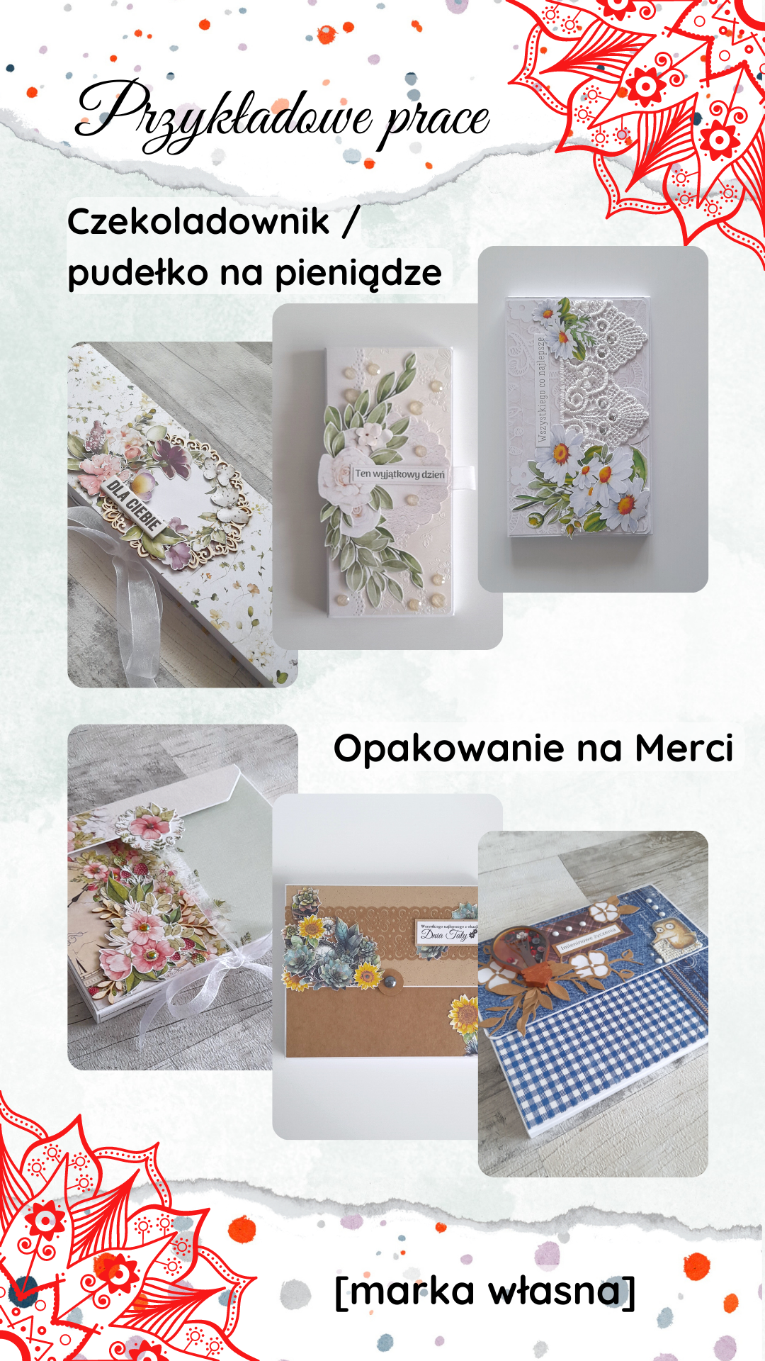 - pudełka na pieniądze czy drobne upominki: czekoladowniki (od 50 zł), opakowanie na Merci (od 60 zł);