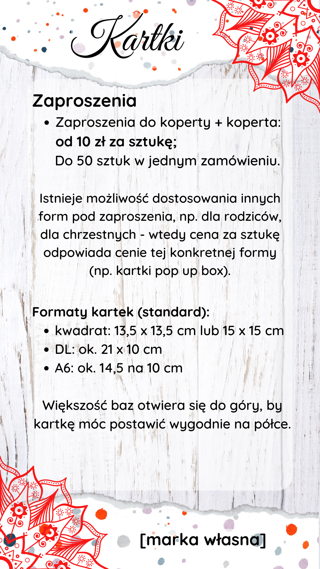 - zaproszenia na ważne uroczystości (do 50 sztuk – od 10 zł za sztukę);
