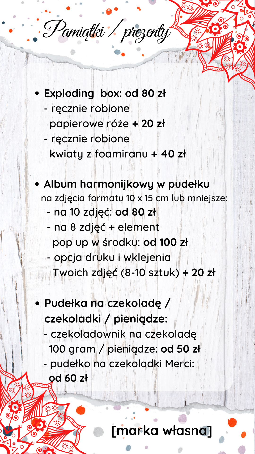 - albumy harmonijkowe na kilka zdjęć z elementem pop up (od 100 zł) lub bez (od 80 zł);