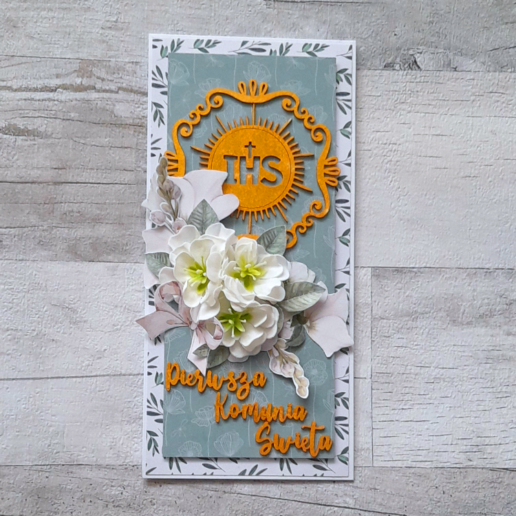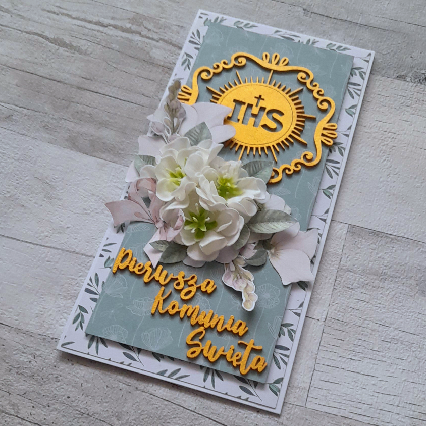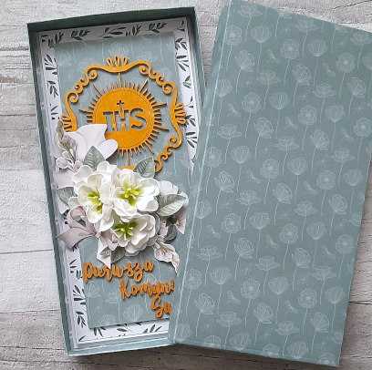 Bogato zdobiona kartka, którą można wręczyć albo na, albo w pudełku.